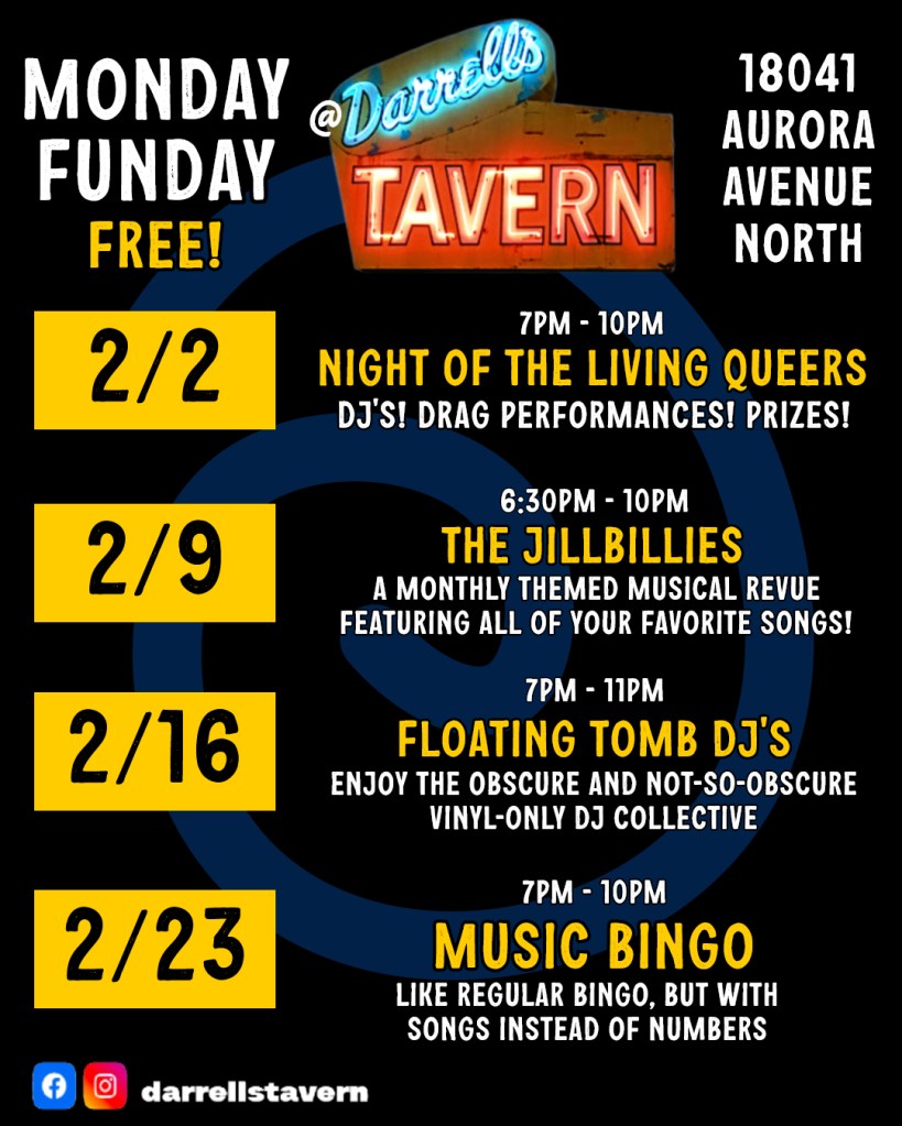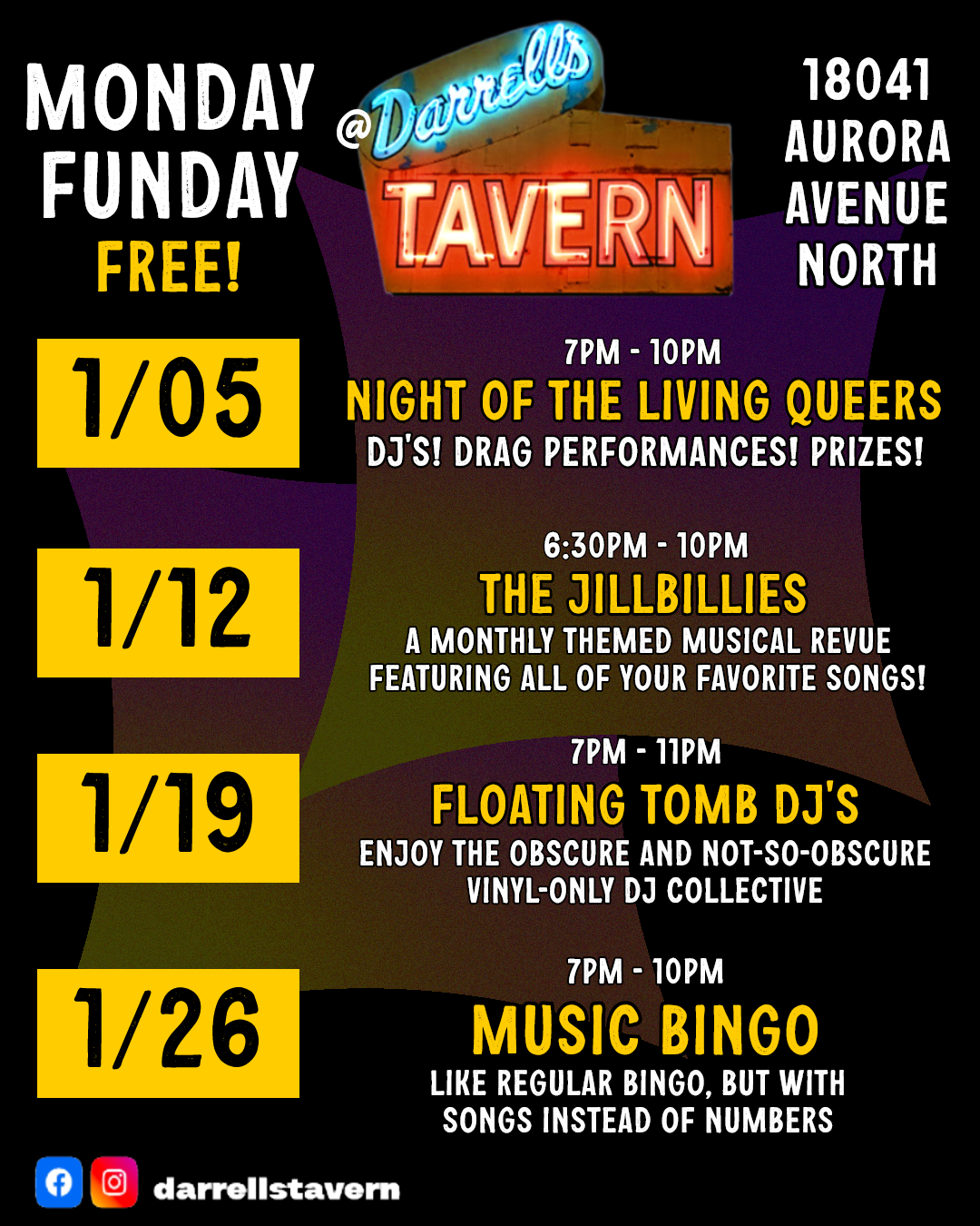 Welcome to Darrell’s, where your dad used to drink. We are a popular dive bar north of Seattle on 180th and Aurora. Carpet on the walls, classic decor and Jestsons-era lighting are the perfect backdrop for cheap drinks and entertainment.